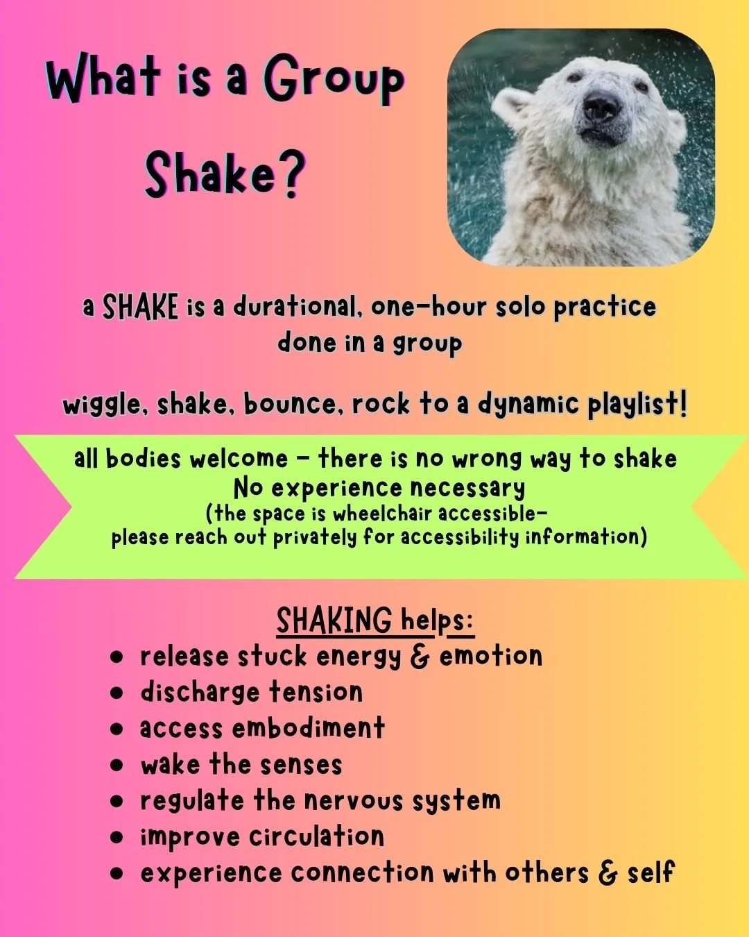shake practice can be accessed by any body- there is no wrong way to shake! (the space is wheelchair accessible- please reach out via my contact form for information about accessibility)