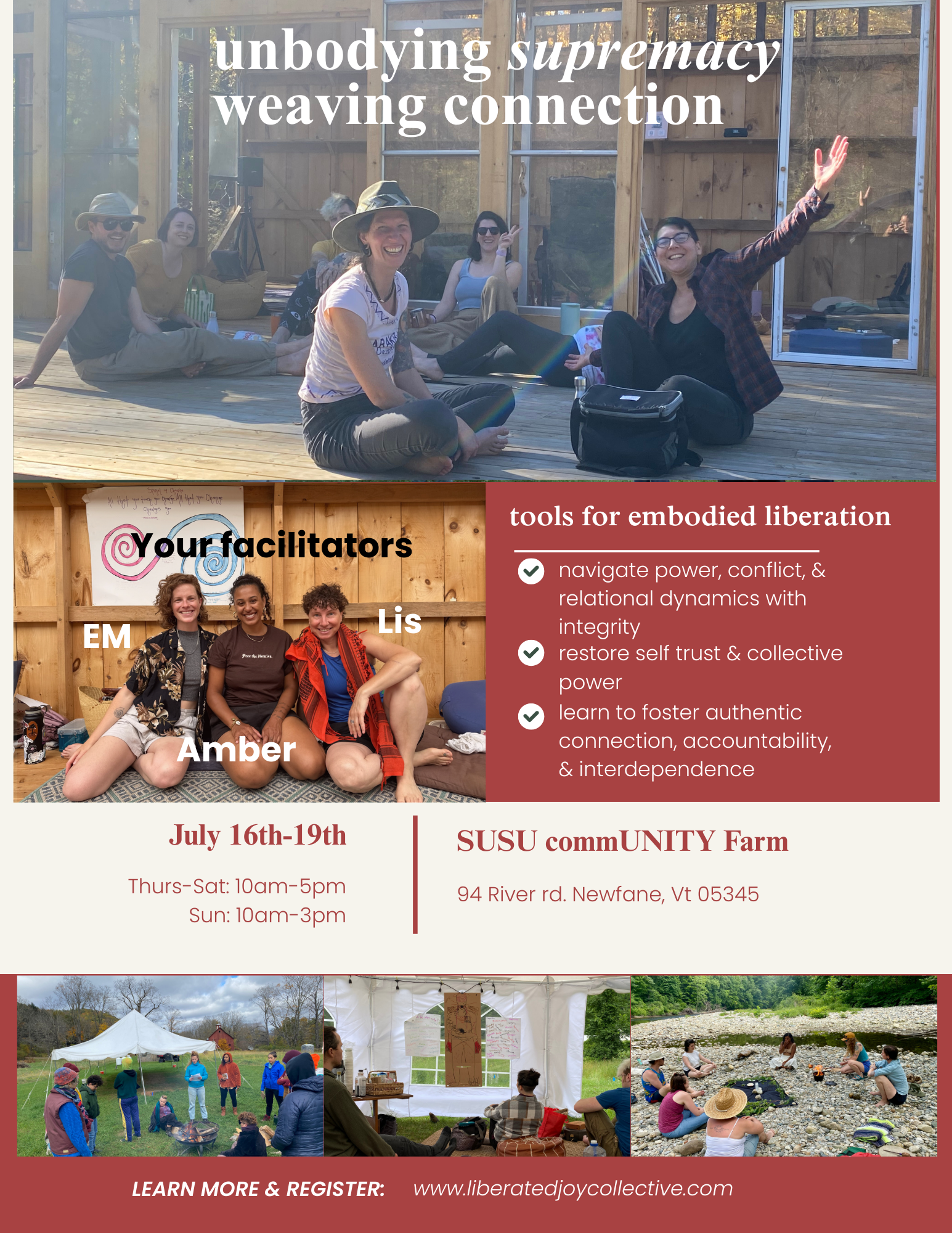Join Amber Arnold, Em Megas-Russell, and Lis Newell for a transformative in-person intensive of unlearning, healing, and embodied liberation held on Abenaki land stewarded by SUSU CommUNITY Farm in Newfane, Vermont.