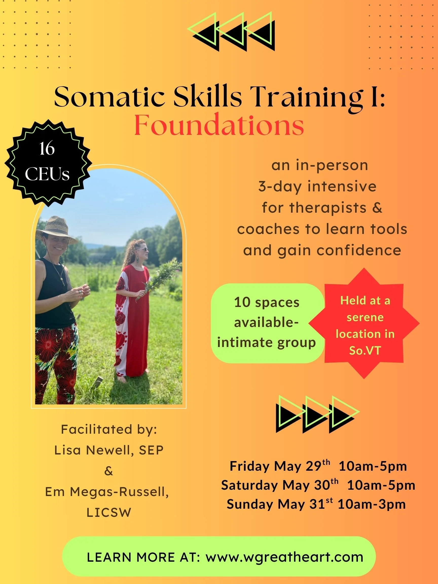This training, designed for providers who have little or no Somatics education but want to get some foundational skills, offers concrete skills, experiential learning, and practice labs to help participants develop greater confidence working with embodiment, nervous system regulation, and relational attunement.